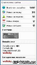 ![]() Шаг 1 - Установка CSS Заходим в П.У - Дизайн - Управление дизайном(CSS) и вставляем код: Code /* Статистика wallaby.ucoz.ru ------------*/