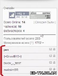 ![]() Установка: Ставим в блок куда вам надо данный ниже код: Code <div style="margin:-5px; margin-top:5px; padding:0px; border-top:1px solid #ccc; background:#f3f3f3; max-height:160px; overflow:auto; overflow-x:hidden;" id="userList">