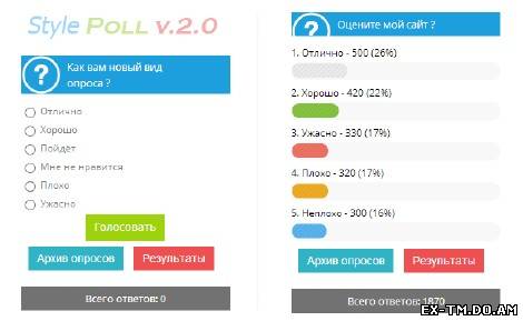 Новый цветной вид опроса второй версий включает в себя графический стиль с заменой цвета. не чего удивительного и нового почти нет, просто иное оформление и вывод в блок вашего сайта. У данного вида опроса, ширина полосы ответа нормальной длины.